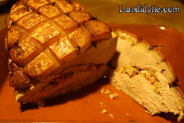 Die Zubereitung ist etwas aufwändiger, als bei einem “normalen” marinierten Schweinebraten, da in diesem Fall geschnitten, gefüllt und genäht werden muss, aber immer noch bratentypisch überschaubar.