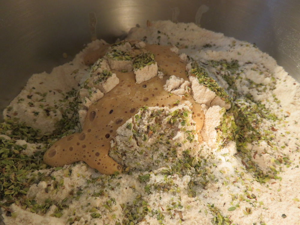 Mehl in eine Schüssel geben und mit der Hand eine Mulde formen. Hefe und 1 TL Honig in einem Teil des warmen Wassers auflösen und in die Mulde im Mehl kippen. Etwas Mehl mit der Mischung verrühren, vom Rand etwas Mehl über die Hefemischung geben und den Vorteig 15 Minuten zugedeckt gehen lassen. Danach die restlichen Zutaten zum Vorteig geben und alles unter Zugabe von dem restlichen Wasser gut verrühren, bis ein sämiger Teig entstanden ist.