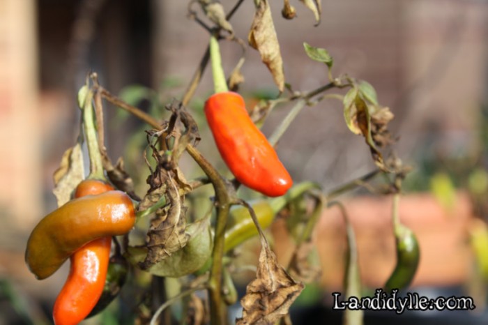 Ich bekam im Frühjahr von meinem Schwager 7 wunderschöne, selbst gezogene Chilipflänzchen. Zwar warnte ich ihn, dass ich mit Chilis und Paprika (Capsicum) anscheinend kein Glück habe, aber er liess die Pflänzchen trotzdem in meiner Obhut. Ich gab ihnen Futter und Wasser sowie einen schneckensicheren Platz an der ungeschützten Süd-West-Seite. Sonnig, aber sehr windig also.