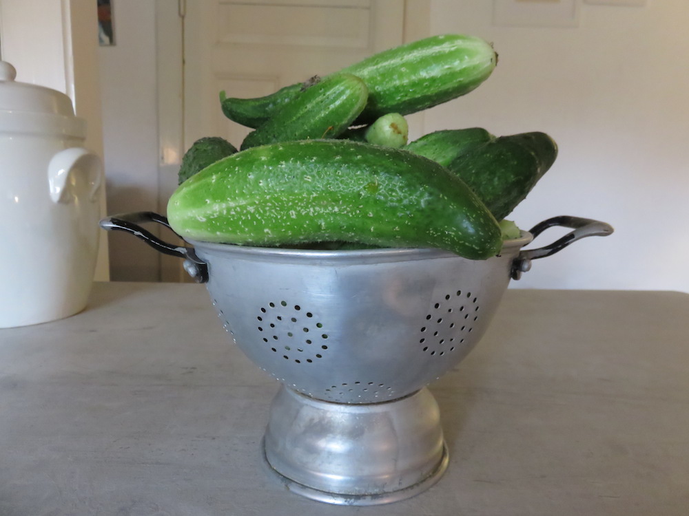 • etwa 2,5 kg Einlegegurken (die Menge hängt auch von der Größe ab, sie sollen sich ja vernünftig ohne Gewalt in den Topf schichten lassen, kleine Gurken = weniger Zwischenraum, grosse Gurken = mehr ungenutzter Raum im Topf)
