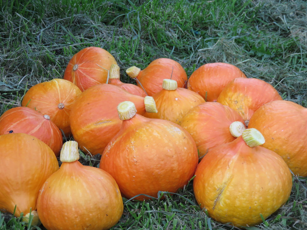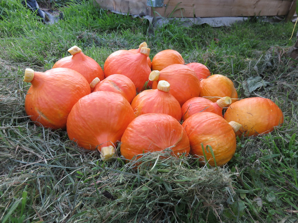 Kleine und mittlere Früchte wurden am Blütenansatz braun, dann insgesamt braun gesprenkelt und dann fielen sie ab. Mittlerweile denke ich, dass wir gut beraten sind mit einer Ausbeute von insgesamt 20 Hokkaidos zufrieden zu sein. 2 hatte ich schon geerntet, diese 15 kommen hinzu und an den Pflanzen hängen auch noch einige, die weiter ausreifen sollen. Rechnet man die Kürbisse ab, die wir jedes Jahr verschenken, bleiben uns etwa 12. Essen wir die Hokkaidos als Lagergemüse ab Januar, so können wir immerhin bis etwa in den April hinein wöchentlich Hokkaido essen, von einem Kürbis essen wir je nach Gericht mindestens 2 Tage – man könnte also zufrieden sagen, dass diese Ernte einen guten Teil zur Selbstversorgung über den Winter beiträgt.