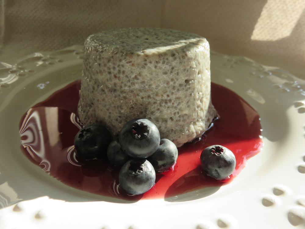 Die Zutaten zusammen aufkochen und etwa 10-15 Minuten weiterquellen lassen. In eine mit kaltem Wasser ausgespülte Flammeri-Form oder einzelne Crème brûlée-Schälchen füllen, erkalten lassen, stürzen, dekorieren und servieren. Der Blaubeer-Sirup passt z.B. ganz ausgezeichnet.