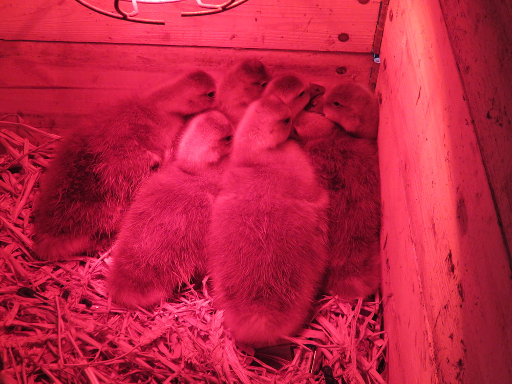 Zu guter letzt haben wir es ja aber bewerkstelligt an sechs Gössel zu kommen, die waren noch recht klein, logischerweise nicht durchgefiedert und mussten daher in eine geschützte warme Box unter Rotlicht. Die Nachteile von Kunstbrut. Empfehlenswert finden wir zu diesem Zweck Europaletten mit Aufsatzrahmen – zumindest wenn man keine ausreichend große Kinderaufzuchtstation besitzt oder schnell zusammenzimmern will/kann.