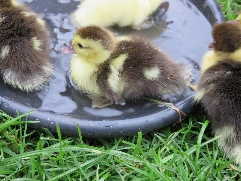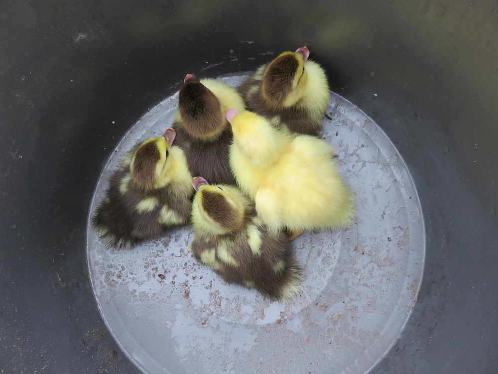 Ich erklärte der Mutter mein Vorhaben und stieß auf keine Gegenwehr, als ich 1, 2, 3, 4, 5 ihre Winzlingsküken in den ehemaligen Kohlweißlingseimer steckte, ‚eine von den weißen‘ ergriff und über den Zaun warf. Die Mutter-Kind-Einheit hatte ich direkt nachdem ich die Darwin-Familie erblickt hatte vorbereitet und so konnten die Glücklichen direkt in die Sicherheit, vor den Widrigkeiten des Gartenlebens geschützt, entlassen werden. ‚Eine von den weißen‘ zeigte sich fortan und bis jetzt als gute Mutter, sie führte die Schar sofort zum Trog und zeigte ihnen, wie man leckeren, industriell hergestellten Kükenstarter pickt anstatt Spinnen zu jagen. Direkt danach ging es zur Tränke wo die Kleinen ihrem sicher nicht von der Mutter geerbten Instinkt folgten und ein Bad nahmen. Nichtschwimmer, wegen siehe oben.