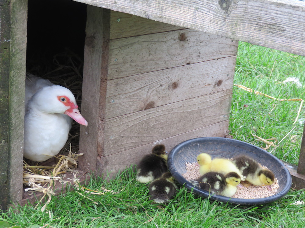 Heute war ich nachmittags außerplanmäßig im Entengehege um zu überprüfen, ob einer der Herrschaften nicht vielleicht doch Kohlweißlingsraupen fressen möchte (nein, das will keiner), als ich etwas weißes am hintersten Ende des Geheges aufblitzen sah. Dort befindet sich ein von Maschendrahtzaun abgetrenntes Areal, in dem unser Weidenrondell von Rehen und Gänsen unzerpflückt vor sich hin wächst. Ansonsten benutzen wahrscheinlich nur Fuchs und Marder diese Passage, man muss ja immerhin über die Zäune, wenn man zum Teich oder ins Entengehege will. An sich kann man sich dieses Rondell wie eine Reuse vorstellen, die über eine Länge von bestimmt 20 Metern in dieser Sackgasse mündet. Elsbeths Tochter führte ihre 11 Küken vor einigen Wochen von noch einer hakeligeren Position im Zick-Zack korrekt zum Ziel. (Merke: es war richtig, von dem Nachwuchs einen zur Nachzucht vorzumerken). ‚Eine von den weißen‘ nahm den anderen Weg. Ob das jetzt todesmutig oder dumm war, wage ich nicht zu beurteilen, aber es ging ja gut, denn ich fand die Familie.