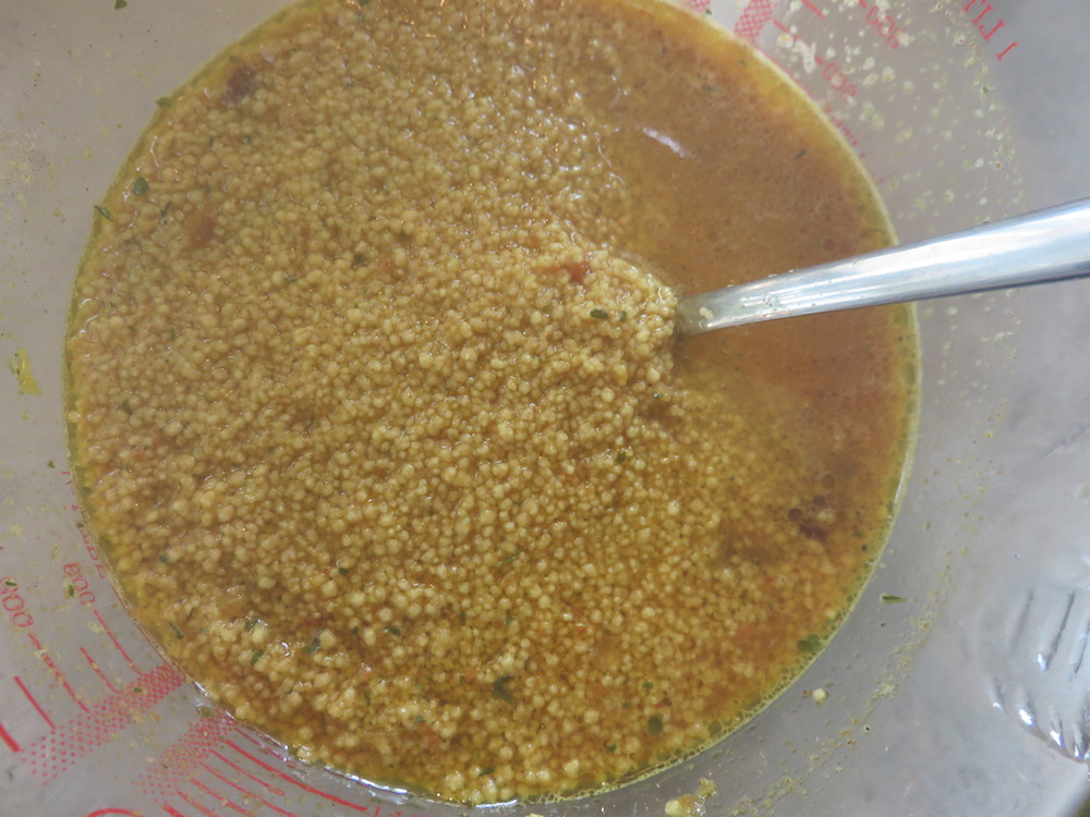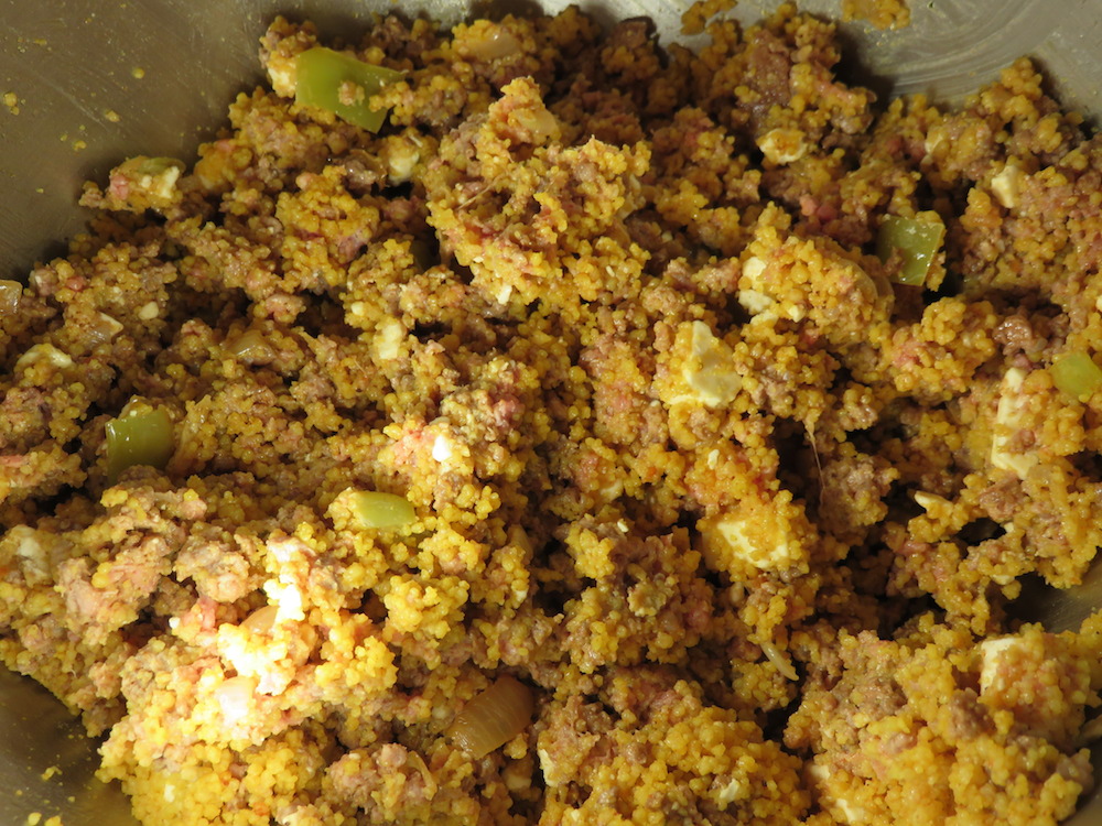 Die Gewürze mit dem Olivenöl und CousCous vermischen, mit Brühe aufgießen und nach Vorschrift quellen lassen. Nach dem Abkühlen, in Würfel geschnittenen Feta zufügen. Eine Zwiebel würfeln und zusammen mit dem Hack in Olivenöl anbraten, bis es halb fertig gegart ist, mit Paprika würzen. Abkühlen lassen und dann zur CousCous-Mischung geben.