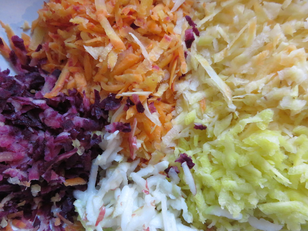 Saftige Karotten sind das A und O, mit diesen staubtrockenen Exemplaren, die man mitunter findet, wird das nichts. Dann braucht man einen saftigen, aromatischen Apfel. Keinen dieser modernen milden Sorten, die rosa aussehen und eine eingetragene Marke sind. Ich mag Elstar, aber bei den vielen Hundert Apfelsorten, sind ausreichend gute dabei. Dieses Mal hatte ich es testweise mit einem ‚Schulgartenapfel‘ probiert, aber der ist durchgefallen. Ebenfals schlicht und ergreifend benutze ich Sonnenblumenöl, Zitronensaft und einen Schuß Apfelessig zum Anmachen. Dazu eine Prise Salz und frisch (grob) gemahlenen Pfeffer, perfekt.