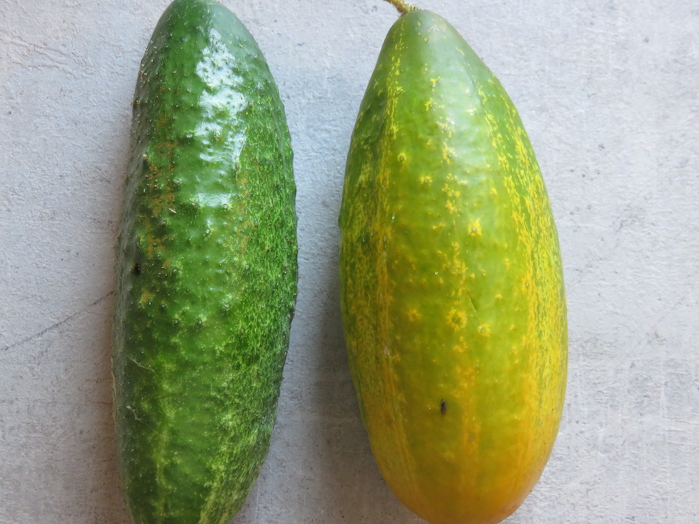 Leider lässt sich aufgrund des Wildwuchses im Gurkenbeet nicht mehr genau nachvollziehen, wieviele Einlegegurken der Sorte ‚Extra early green prolific‘ (links?) ich gesetzt habe, aber es können nicht mehr als 2 gewesen sein. An sich. ‚Vorgebirgstrauben‘ (rechts?) eine noch dazu. Eigentlich. Das Problem ist: die Vorgebirgstrauben sehen genauso aus, wie auf vielen Fotos von Samenhändler, eine prägnante, glatte, ovale Form mit einseitig gelber Färbung. Die ‚Extra early green prolific‘ sehen leider gar nicht so aus, wie auf Samenpackungen. Die Sorte, die ich dafür halte hat sich wirklich bewährt, sehr früher, sehr reicher Ertrag von Einlegegurken, die genau so aussehen, wie ich mir Einlegegurken vorstelle.