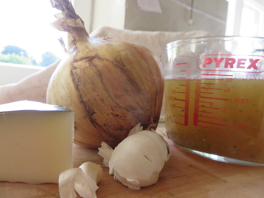 Die Zwiebel(n) werden in reichlich Butter gedünstet, ohne sie bräunen zu lassen, der Knoblauch wird nach kurzer Zeit zugegeben. Mit der Brühe ablöschen und etwa 15 Minuten köcheln lassen. Eine Prise Zucker zugeben. Man kann nun die kleingeschnittene Kartoffel mitgaren und später zum Pürieren herausfischen, sie separat kochen oder eine gekochte Kartoffel vom Vortag nehmen.