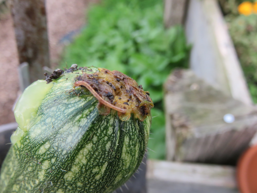 Müsste ich mich festlegen, würde ich dem Foto nach darauf tippen, dass sich bei uns Eisenia foetida im großen Stil über faulende Zucchini, zu eng stehende Salate und leer stehende Schüsseln hermacht. Wobei, sie machen sich nicht über die Pflanzen oder Pflanzenreste an sich her, sondern über die Mikroorganismen, die verrottendes Pflanzenmaterial besiedeln.