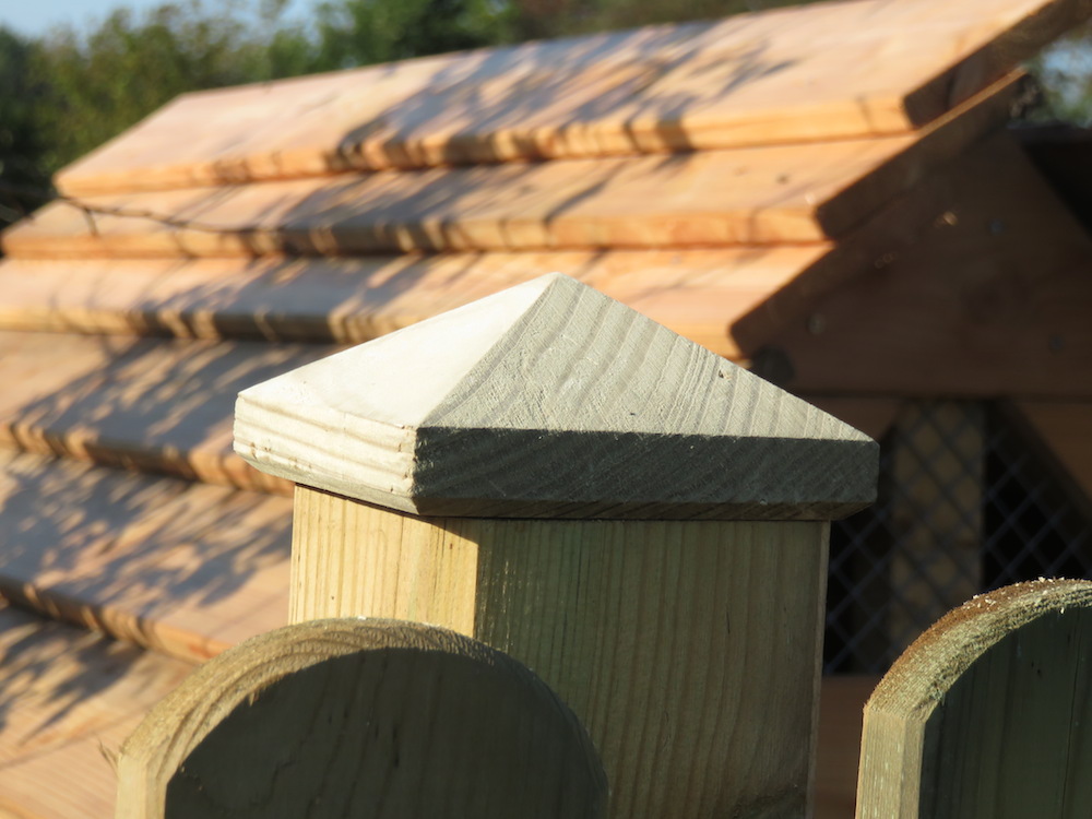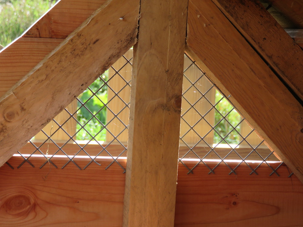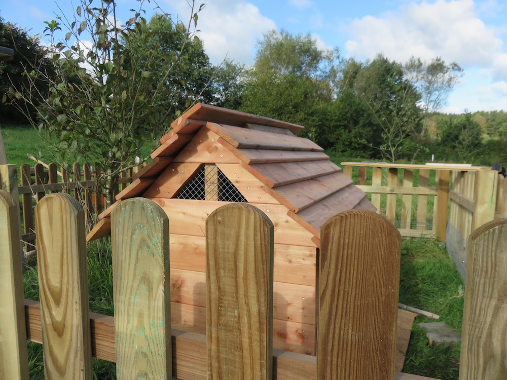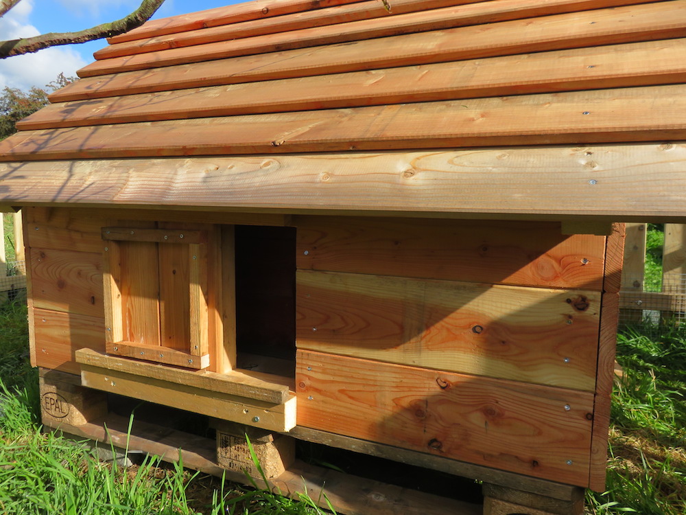 Die Damen haben nun ein Appartement mit 2 Schlafzimmern, 1 Kinderzimmer und einem großzügigen Eingangsflur zur Verfügung. Das ganze besteht aus unbehandelter Lärche, die besonders schön aussieht, wenn sie grau verwittert ist. Die Bretter sind überlappend angebracht wie bei unserem Haus, dem Schuppen und dem Hühnerstall, abgerundet wird das Bild durch eine Scheunen-Schiebetür. Auf der einen Giebelseite gibt es ein mit Volierendraht gegen Marder gesichertes Fenster und das ganze Haus steht sozusagen auf Stelzen und nicht direkt auf dem Erdboden – die Unterkonstruktion besteht nämlich aus Gehwegplatten und einer Euro-Palette.