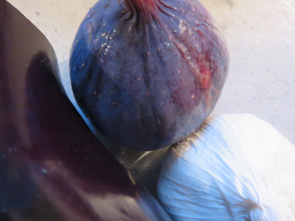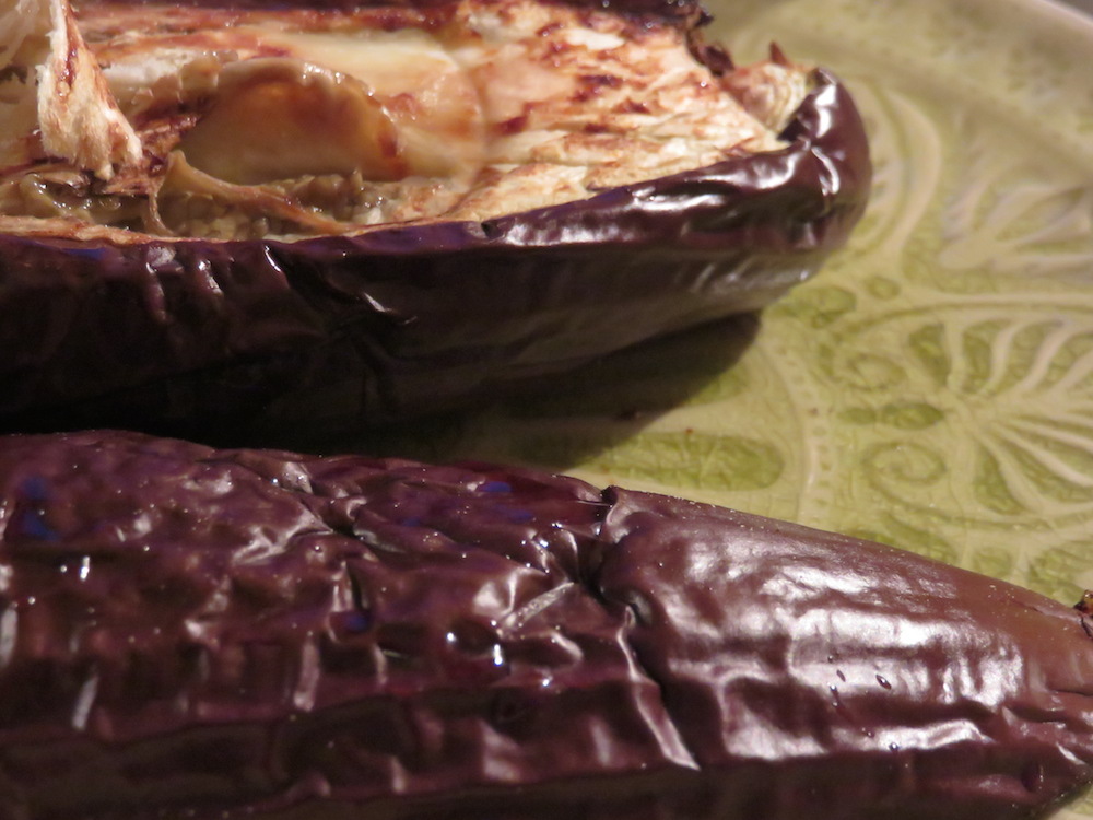 Die Aubergine und die Feigen werden gewaschen und bei 200° auf einem Backblech in den Ofen geschoben. Die Feigen sind zuerst gar; sie sondern Saft ab und können dann zum Abkühlen entnommen werden. Die Aubergine braucht länger, ich habe sie der Länge nach aufgeschnitten, um die Zeit etwas abzukürzen. Die Aubergine muss wirklich ganz gar und cremig sein, die Haut wirft dann Bläschen und bräunt sich. Dann wird auch die Aubergine entnommen und muss etwas abkühlen.