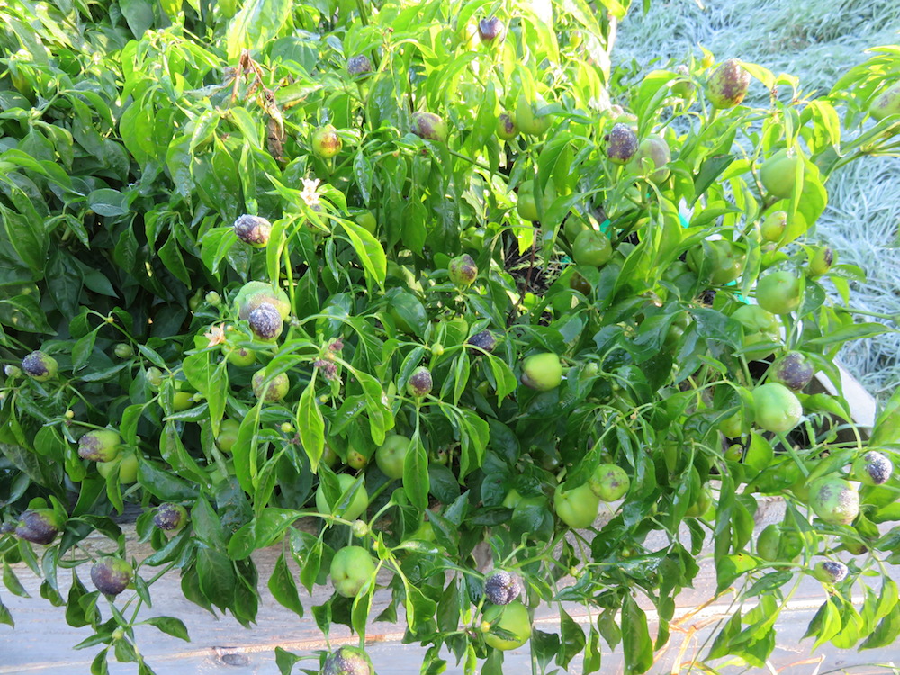 Am dringlichsten war die Situation naturgemäss bei den Exoten; die Paprikas und Chilis haben den Frost übel genommen und mussten als erstes gerodet werden. Auch die Kürbisse haben schlapp gemacht, die letzten verbleibenden Früchte, die ich nach der Frosteinwirkung geerntet habe, müssen als erstes verwendet werden weil sie nicht solange lagerfähig sind. Yacon, Süßkartoffel, Tomatillos und Ananaskirschen haben erstaunlicherweise nur wenige, kleine Verfärbungen oder ein wenig die Blätter eingerollt. Etwa 1/3 meiner nicht winterharten Exoten und Kräuter habe ich nun bereits ins Haus geräumt oder zumindest hochgestellt, die nächsten Tage werden sehr arbeitsintensiv, denn nicht nur müssen die restlichen Frostköttel geerntet oder reingeholt werden, nein auch die Ernte will gut verstaut, in Sand eingeschlagen, gewaschen, geputzt, blanchiert, eingekocht und/oder eingefroren werden. Derzeit stauen sich die Eimer voll mit Gemüse bis in den Windfang. Wir hatten also ein gutes Erntejahr und sind gesegnet, dass wir in der Lage sind, nicht nur die Grundnahrungsmittel sondern auch Delikatessen selber anzubauen.