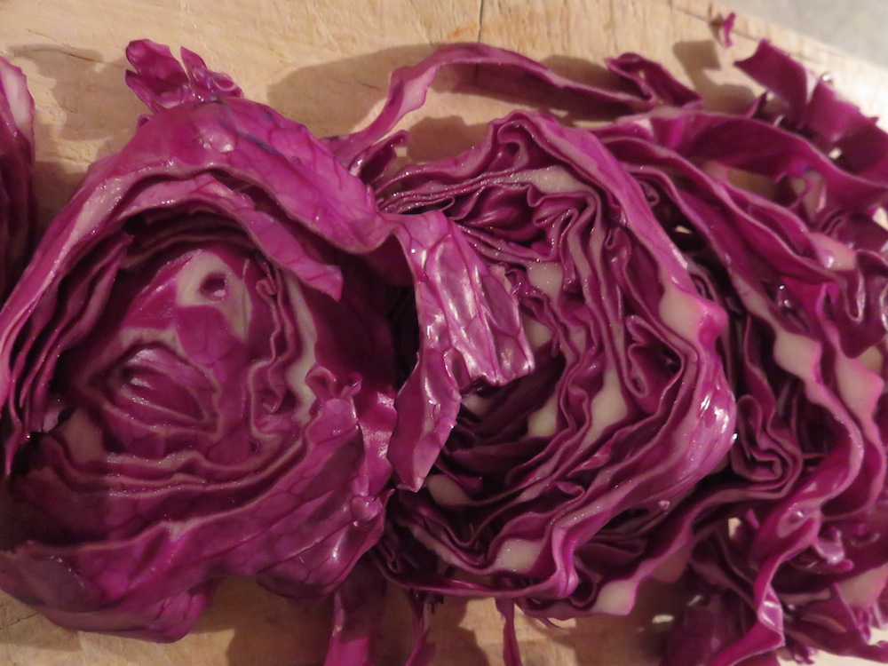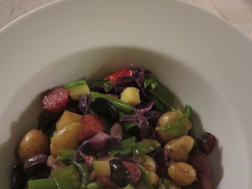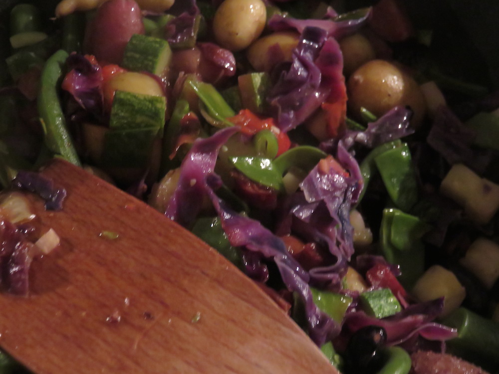 Die Zwiebel mit der Cabanossi in reichlich Olivenöl anbraten, dann den Rotkohl zugeben. Dann in dieser Reihenfolge Kartoffeln, Zucchino, Bohnen, Knoblauch, Zuckerschoten und Tomaten. Das Gemüse zieht nun Wasser und kann noch solange schmoren, bis alles gar ist aber noch Biss hat.