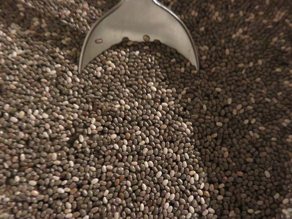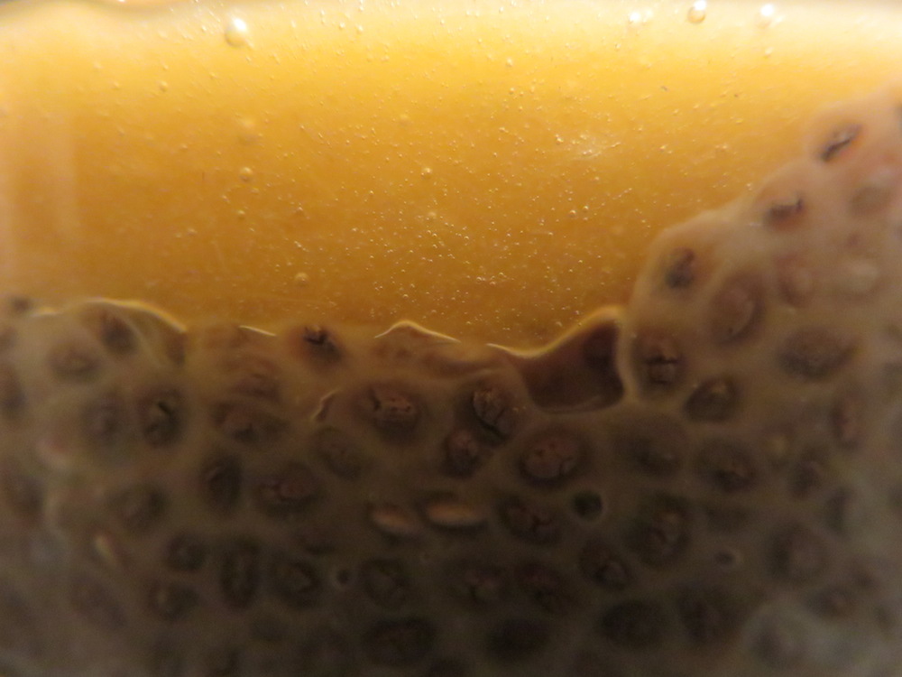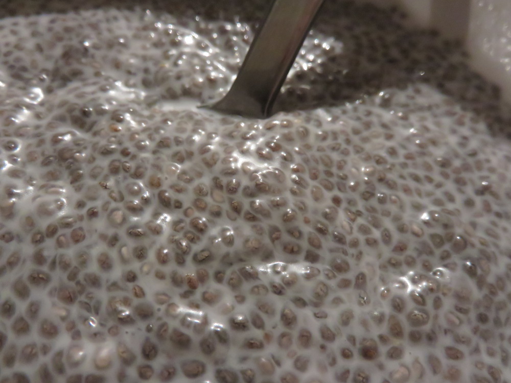 Sehr einfach aber doch lecker und gesund ist diese Nachspeise von neulich. 4 EL Chia-Samen in einer Mischung aus etwa 50ml Kokoscreme und 50ml Mangosaft mindestens anderthalb Stunden quellen lassen. Einen großzügigen Teelöffel ‚brown sugar‘ zugeben. Leider ist mir entfallen, wie der auf deutsch heißt, es handelt sich um den dunklen, klebrigen Rohrzucker mit Melasse, der in den USA viel verwendet wird. Nach der Quellzeit die Chiamischung gut durchrühren und auf 3 Gläser verteilen.