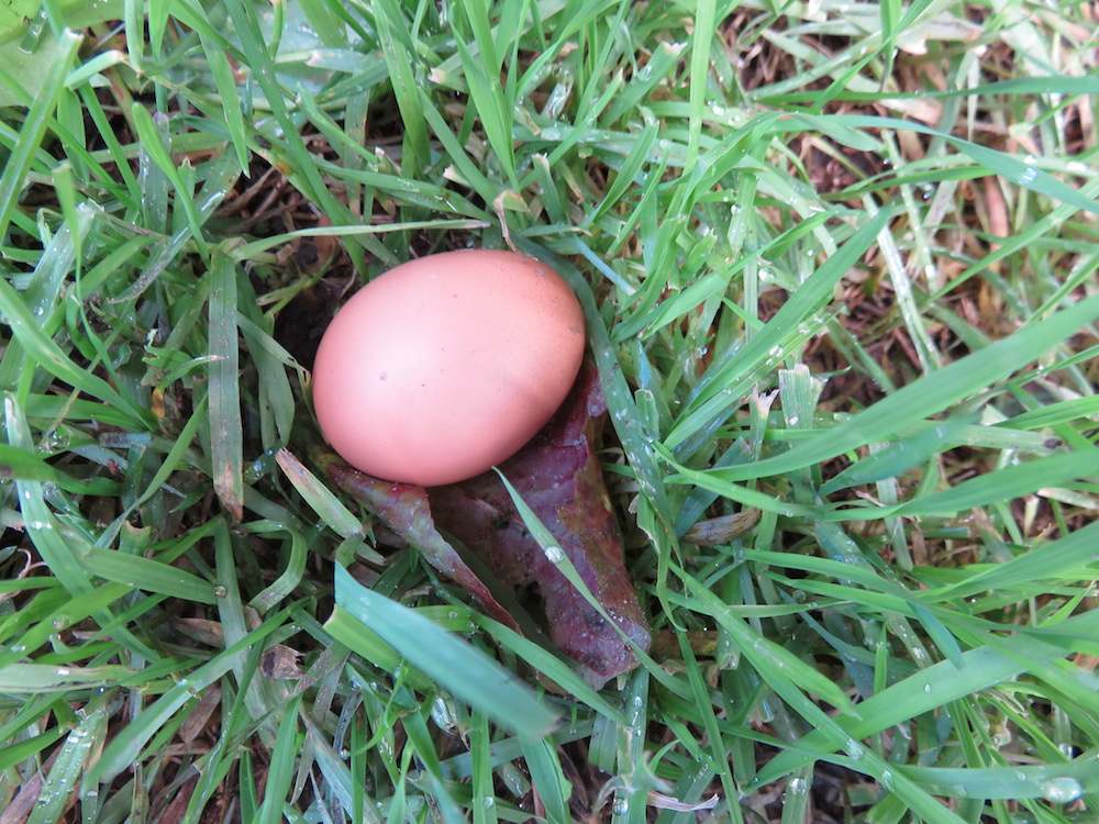 Die Hühner vertrugen sich erstaunlich gut. Noch besser als erhofft. Die Vorwerkdamen waren vorübergehend ’not amused‘, dass erst alle Hähne weg waren und dann plötzlich die trivialen Konkurrentinnen auftauchten. Sie hackten daraufhin kurz und zaghaft. Das war aber sehr harmlos und schon heute scharrten und pickten die Tiere einträchtig nebeneinander. Und siehe da, plötzlich am Nachmittag gab es das erste Ei. Ein gutes Gefühl, dass auch die kontinuierliche Eiweißversorgung vom lebenden Tier und im kleinen Stil jetzt vom eigenen Hof kommt. Die Sperberin war es wohl, sie hat uns ein Mini-Ei geschenkt.