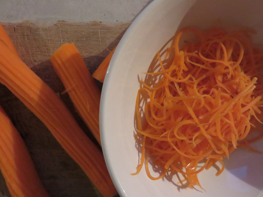 In einem separaten Topf etwas Wasser zum Kochen bringen und die Julienne geschnittenen Karottenstreifen dünsten bis sie biegsam sind.
