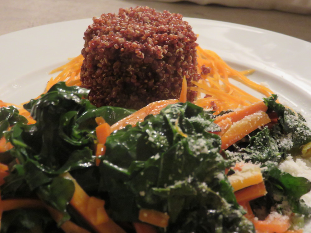 Quinoa löffelweise in eine kalt ausgewaschene Crème Brulée-Form oder ähnliches geben und auf einen Teller stürzen, die Karottenstreifen ringsrum drapieren, Kohlgemüse anrichten und geniessen. Pecorino rundet den Geschmack sehr gut ab finde ich. Dies ist ein sehr feines, mildes Gericht mit unverwechselbaren Geschmäckern da sowohl Quinoa, als auch der russische Kohl sehr eigen schmecken. Eben süßlich-nussig-mild.