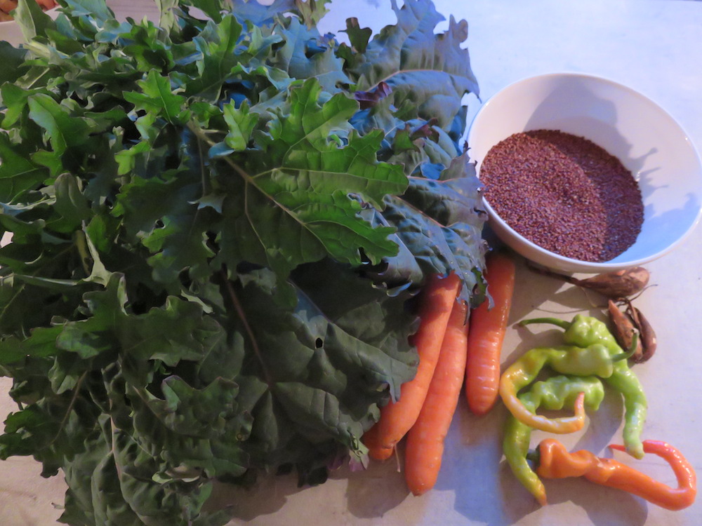 Dieses Jahr haben wir als Wintergemüse unter anderem den Blattkohl ‚Russischer Roter‘ angebaut. Er hat gefiederte, grün-türkisfarbene Blätter, die teilweise rot überhaucht und teilweise rot gerändert sind. Der sibirische Kohl soll extrem winterhart sein, ob dem so ist werden wir vielleicht feststellen. Die Blätter können immer wieder geerntet werden und nach dem Winter treiben sie wohl schnell wieder aus. Der Geschmack ist mild-süsslich-nussig, die meisten Quellen beschreiben den Geschmack zwar als ‚kohlrabiartig‘, aber das konnten wir nicht feststellen. Dass soviele Shops den Geschmack gleichlautend so ganz anders beschreiben als wir ihn wahrnehmen, ist vielleicht ein klassischer und leider häufiger Fall von Abschreiberei. Anstatt von eigenen Erfahrungen zu berichten, wird schnell aus den Angaben der Konkurrenz ein kleiner Steckbrief zusammen geschustert. Wie auch immer, mild-süsslich-nussig ist er sage ich und darauf kommt es hier ja an. Er ergänzt sich also prima mit nussigem rotem Quinoa und süßlichen Karotten.