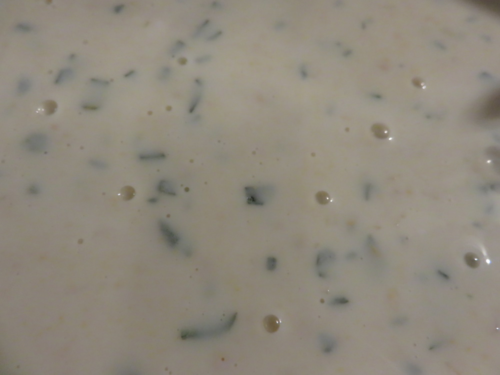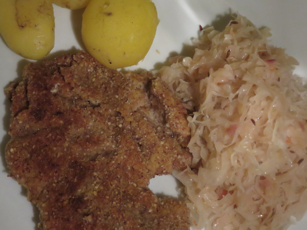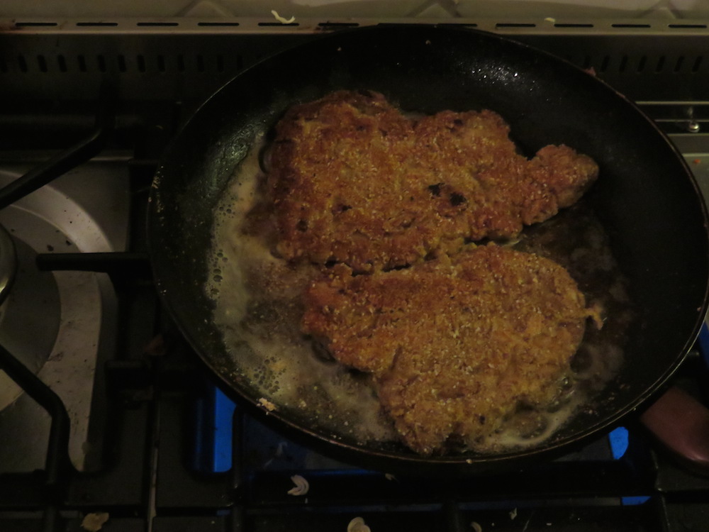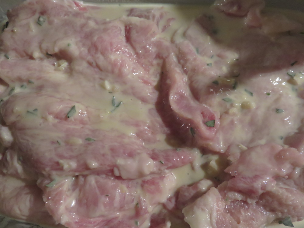 Die Schnitzel, die in unserem Fall ausgelöste Karbonaden waren, werden in einer Salbei-Senf-Knoblauch-Buttermilchlake eingelegt und später mit einer Panade aus gemahlenen Mandeln versehen.