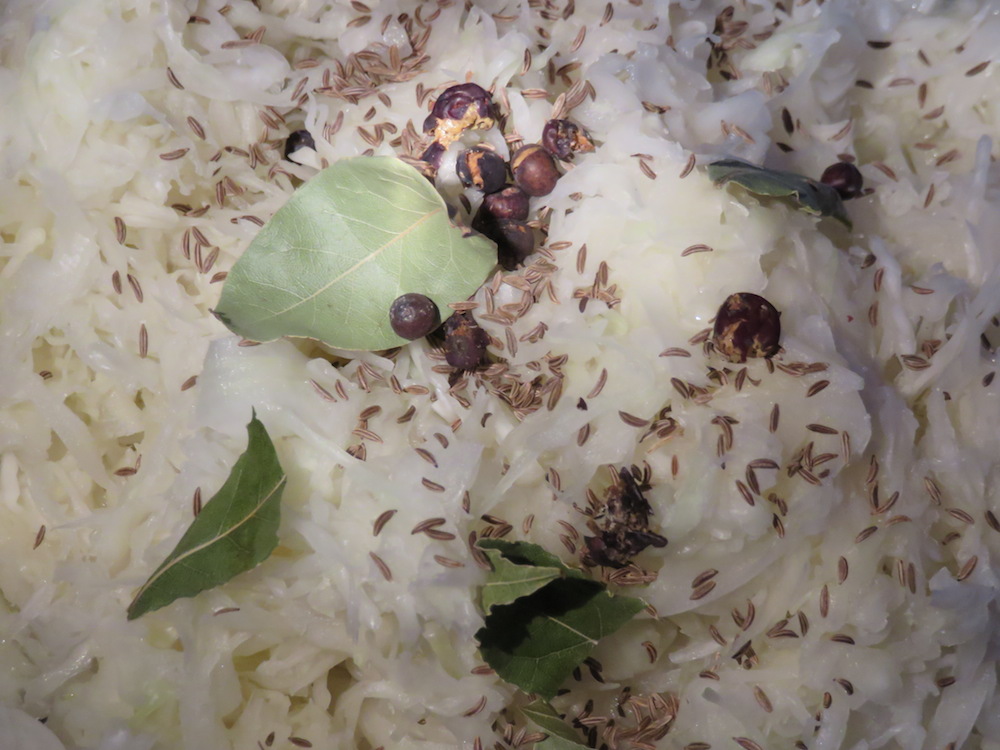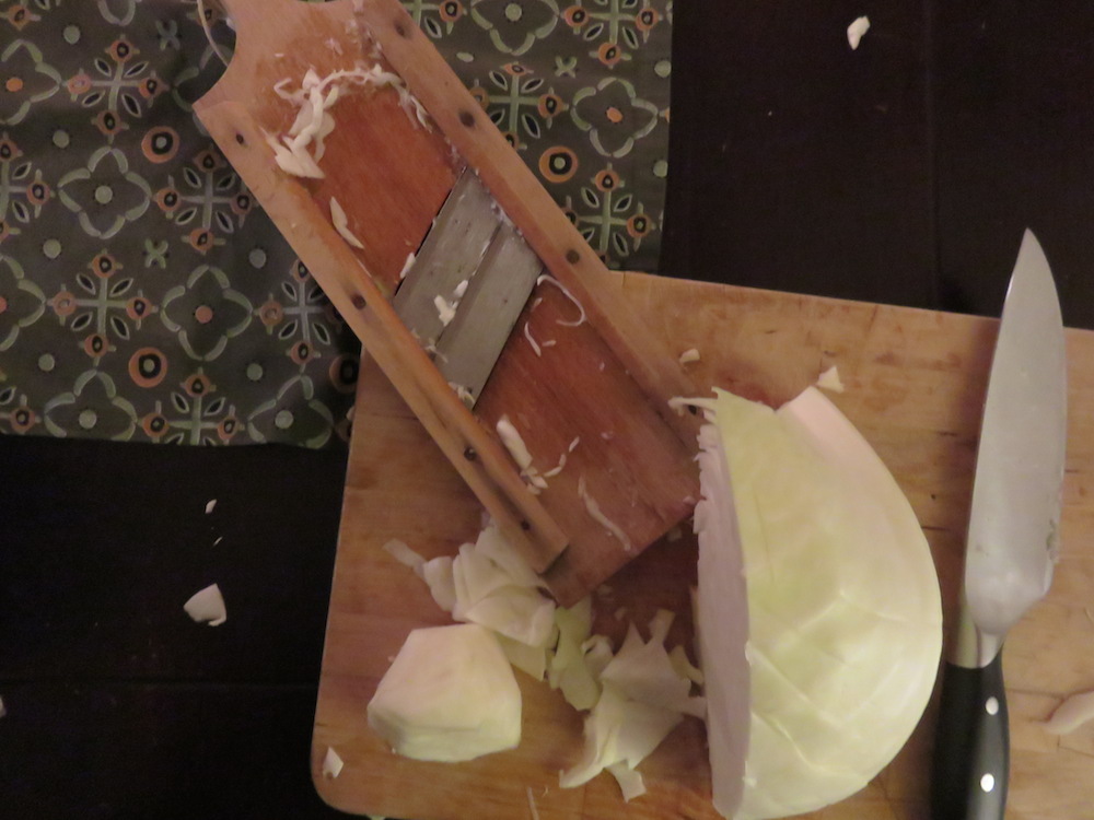Dieses Rezept – so unspektakulär das Ergebnis oben im Bild auch aussieht – verlangt etwas Vorbereitung. Ein halber Kohlkopf muss gehobelt und mit Salz und Gewürzen geknetet werden, dann luftdicht abgeschlossen für 24 Stunden an einen kühlen Ort zum Fermentieren gestellt.