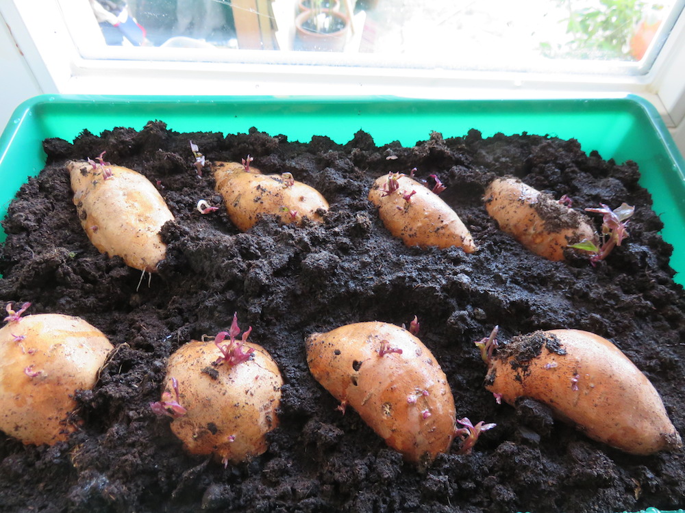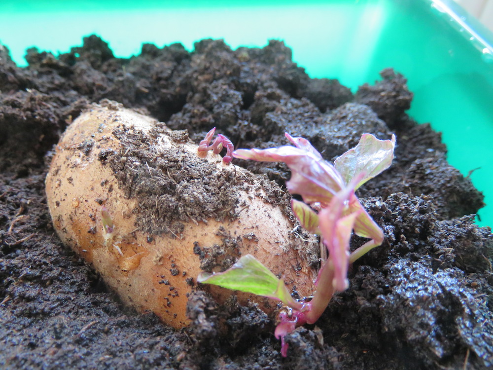 Angezogen habe ich die Süßkartoffeln recht spät im Jahr aus normaler Biomarktware in Zimmergewächshäusern. Das Substrat war Anzuchterde und ich habe für ein warm-feuchtes Milieu gesorgt, indem der Deckel aufgesetzt und eine Heizmatte für Terrarien untergelegt wurde. Die Knollen keimten zuverlässig und recht schnell, bildeten bald darauf Laub und konnten ausgepflanzt werden. Vielleicht wäre mein Versuch erfolgreicher verlaufen, wenn die von mir beeinflussbaren Bedingungen wie Zeitpunkt der Anzucht, Düngung und Platzangebot günstiger gewesen wären. Erschwerend hinzu kam, dass dieses Jahr allgemein etwas schwierig für den Anbau von Nutzpflanzen war da es lange kalt war, oft verregnet und es einen frühen Frost gab. Gefühlt war das Jahr kälter als normal. Interessant wäre auch in Erfahrung zu bringen, ob andere Sorten auf meinem Breitengrad einen zuverlässigen Ertrag bringen. In der Studie heisst es dazu: „Auch die Züchtung neuer Sorten könnte die Möglichkeit der Bataten- kultur in der gemäßigten Zone fördern. Es ist jedoch schwierig, in unseren Breiten die Batate zur Blüte zu bringen. Selbst in wärmeren Gebieten sind nicht oder schlecht blühende Batatensorten bekannt“