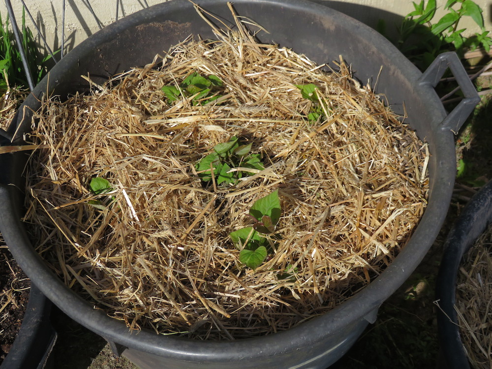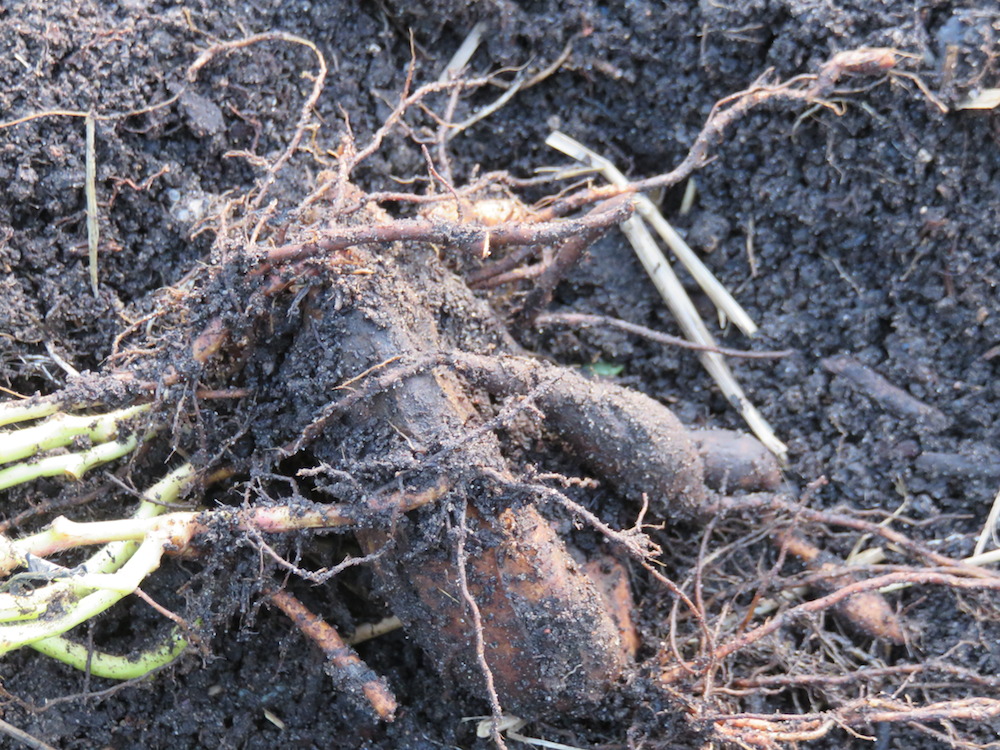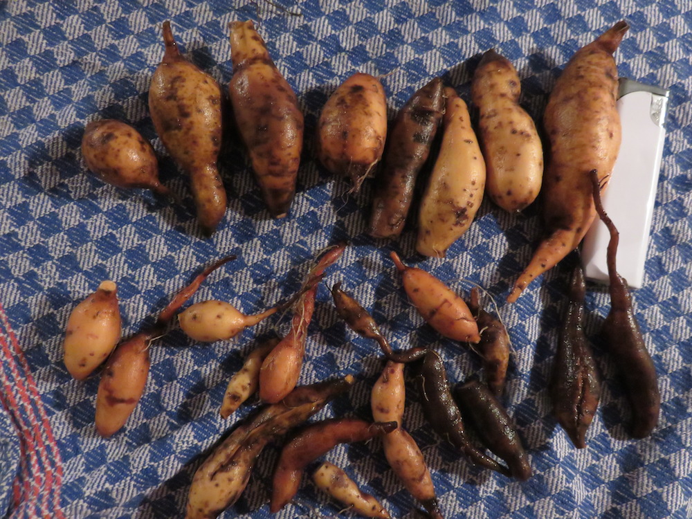In der Studie aus Wien wurden Bataten einer uruguayischen Provenienz in Kultur genommen, es wurden bewurzelte Setzlinge und auch unbewurzelte Sproßteile ausgepflanzt. Die Batate neigt dazu, sehr schnell und unter verschiedenen Bedingungen Wurzeln zu schlagen. Sowohl in Wasser, in feuchtem Milieu und in Substrat entwickelt sie alsbald Wurzeln. Ausgepflanzt wurde nach den letzten Frösten Mitte Mai und geerntet Anfang bis Mitte Oktober. Es wurde ein Ertrag von um die 2,5 bis 3 Kilo pro Quadratmeter an Knollen und ebenso viel Laub erzielt. das Laub kann wie Spinat zubereitet werden und somit an sich voll mit in den Ertrag eingerechnet werden. „Die Knollen aus der Freilandernte sind wohlausgebildet und ansehnlich. Sie sitzen meist zu mehreren an der Pflanze.“ heisst es. „Für arme Böden ist nach Boswell (1950) die Batate nicht geeignet.“ Und das war wahrscheinlich einer der Knackpunkte bei mir. Ich habe die Süßkartoffeln in großen Maurerkübeln angebaut, die ich dann vor die Hauswand an die Süd-West-Seite gestellt habe. Der Hintergedanke war, den tropischen Gewächsen möglichst viele direkte Sonnenstunden zu gönnen. Gedüngt habe ich nur beim Pflanzen mit Hornspänen. Die Verwertung von Hornspänen in Kübeln finde ich nicht optimal und die Pflanzen hatten auch nicht viel Erde zur Verfügung, da sie zu mehreren in den Bütten sassen. Die Knollen sind winzig und länglich, sitzen aber zu mehreren an einer Mutterknolle.