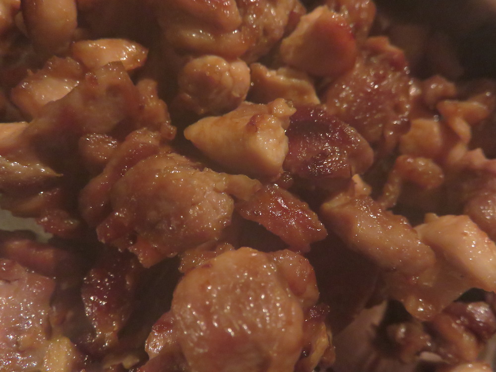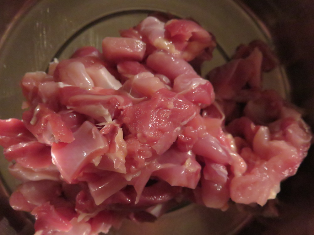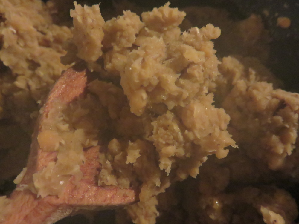 Ich habe etwa 3 Handvoll Hühnerfleisch in Paprikapulver und Ahornsirup mariniert, circa 100g rote Linsen in der doppelten Menge Wasser gekocht, danach mit Salz und Garam Masala abgeschmeckt und mit dem Kochlöffel zu Brei zerdrückt.