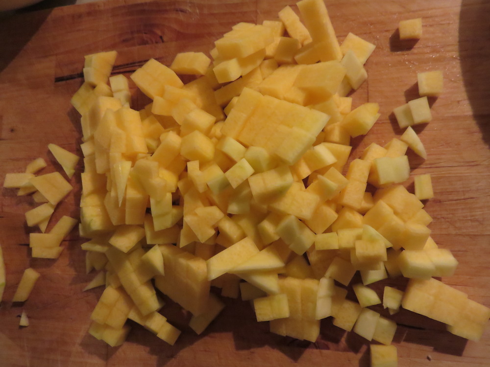 Ein Stück ‚Trombolina d’Albenga‘ aka ‚Tromboncino‘ aka ‚Trombetta di Albenga‘ wurde geschält und in sehr feine Würfel geschnitten, es mögen 200g gewesen sein.