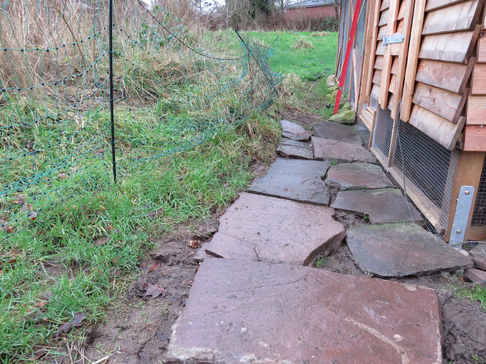 Glücklicherweise hatte eine schöne und schlaue Prinzessin vor einigen Jahren einen Posten rote Sandsteinplatten ersteigert und ein überaus hilfsbereiter Ehegatte samt einem seiner Bruder fuhren zusammen mit ihr in die große Stadt, um die Platten aufzunehmen. Ja, sie waren nämlich noch verlegt und bildeten eine schicke Terrasse. Mehrere schwerst beladene Fahrzeuge und Fahrten später haben wir die Platten hier auf Paletten gestapelt und von einem Bekannten unten in den Garten fahren lassen. Sobald alle etwa 573 wichtigeren Baustellen abgeschlossen wären, wollten wir die Platten zu einem Weg zum See verlegen. Soweit die Theorie und soweit der Exkurs in die Vergangenheit. Gegenwärtig brauchte ich die Platten dringender am Hühnergehege. Selbst ist die Frau und so habe ich schon einmal angefangen, wenigstens in die übelsten Schlammgruben schwere Sandsteinplatten plumpsen zu lassen. Leider, leider verfüge ich zwar über theoretisches Wissen in Natursteinverlegung (keine Kreuzfugen! Unterfüttern! Nivellieren!), bin aber offenbar nicht in der Lage alleine den Untergrund vorzubereiten und diese mordsschweren Dinger so zu verlegen, dass es hinterher ansehnlich aussieht. Schade. Wirklich schade um die gute Idee und die schönen Platten. Wahrscheinlich müssen wir alle Platten nochmals aufnehmen und es richtig machen.