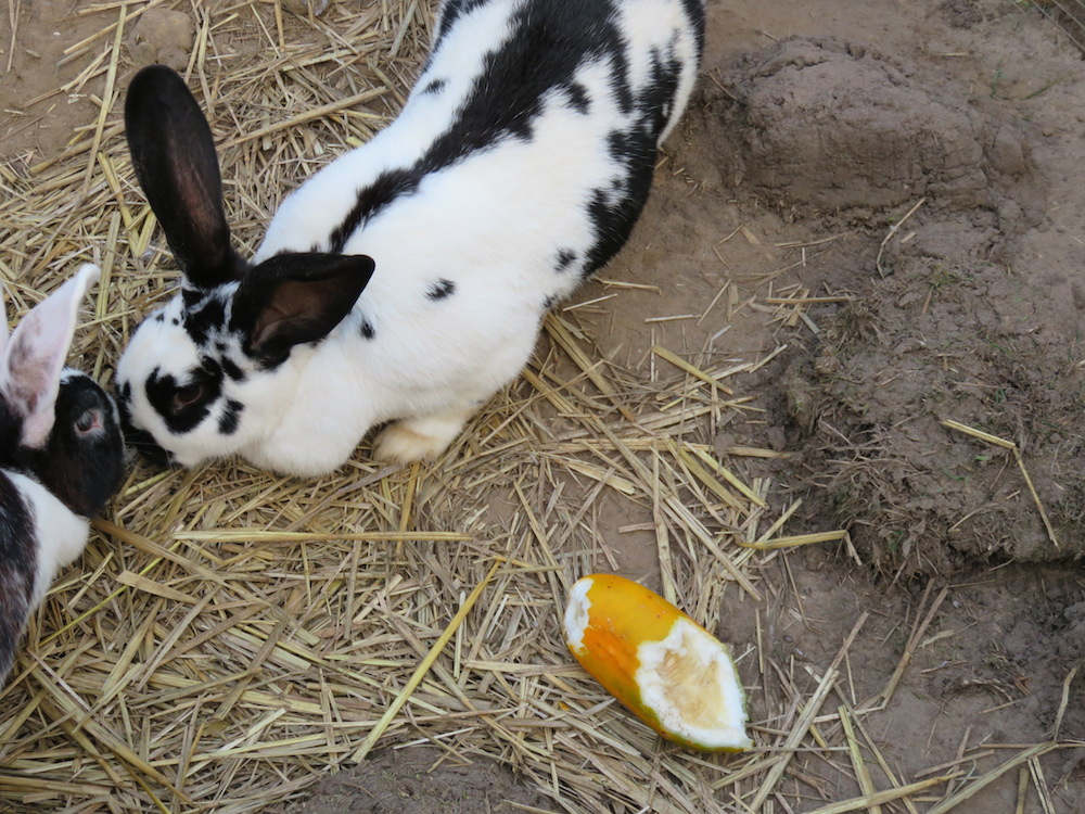 Ich hatte einige Gurken im Beet ausreifen lassen und in der Speisekammer gelagert. Nach dem plötzlichen Frosteinbruch hatte ich die Idee, das Experiment ‚Wie lange halten sich ausgereifte Gurken eigentlich?‘ abzubrechen und die Früchte stattdessen den Kaninchen zu füttern. Siehe da, Gurken werden auch im ausgereiften Zustand gerne gefressen, müssen nicht zugekauft werden, sind recht gut lagerfähig und stillen den Durst auch wenn der Wassernapf gefroren ist.