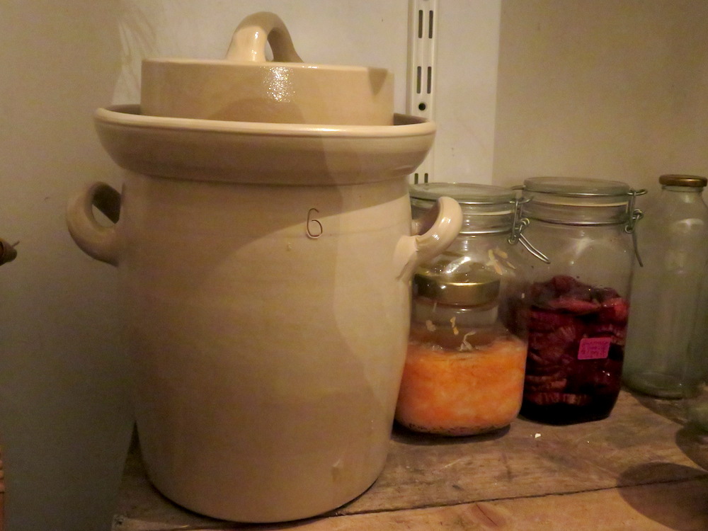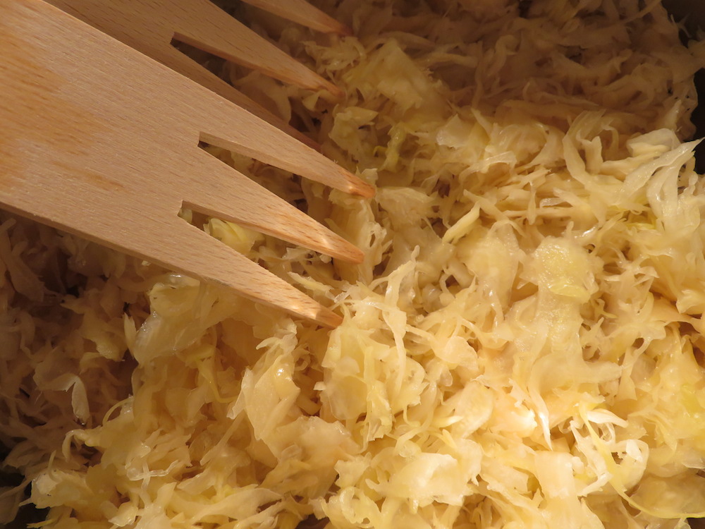 7-14 Tage soll der Gärtopf bei Zimmertemperatur stehen, danach ist dieGärung abgeschlossen und der Topf kann in die kühle Kammer oder ein Treppenhaus geräumt werden. Lässt man den Topf jetzt noch länger warm stehen, kann das Kraut sehr sauer werden. Wir haben den Topf dieses Mal eine Woche bei etwa 12° stehen lassen und danach in die etwa 8° kühleKammer gestellt. Das Ergebnis war dieses Mal perfektt; ein mildes Sauerkraut, nicht zu sauer, gut roh essbar und klassisch gekocht ganz köstlich. Übrigens wirkt Sauerkraut roh probiotisch und generell sind fermentierte Lebensmittel eine große Bereicherung für die Gesundheit.