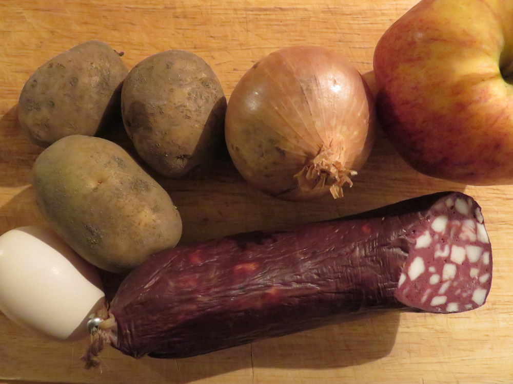 Das hat verschiedene Vorteile; erstmal sieht es nett aus und zweitens hoffte ich, die Blutwurst so meinem Gatten besser schmackhaft machen zu können, der bislang steif und fest behauptete, er möge keine Blutwurst. Kartoffelbrei mag er ohnehin nicht, es sei denn, ich mache ‚Baked Beans‘. An sich wollte ich ihm entgegenkommen und alternativ Speck reichen, aber dann entschied ich mich für die radikale Variante und wäre unter Umständen sogar bereit gewesen, als Zugeständnis einmal Kohlpudding zu machen – den ich wiederum nicht mag. Das war aber nicht notwendig.