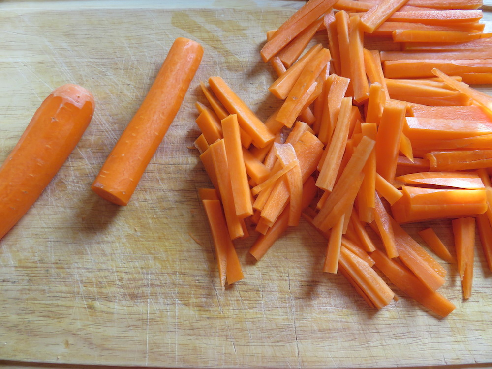 Ich habe also einen 3/4 Weisskohl klein geschnitten und mit 2 Liter Wasser und 1 Teil Sauerkraut aufgesetzt und ordentlich (etwa 150g) Tomatenmark untergerührt. Darauf grob gestiftelte Karotten und klein geschnittene grüne Paprikas aus dem Tiefkühler gegeben und alles eine Weile gekocht.