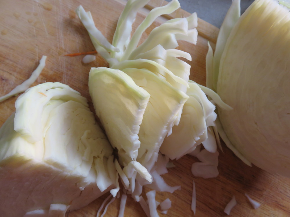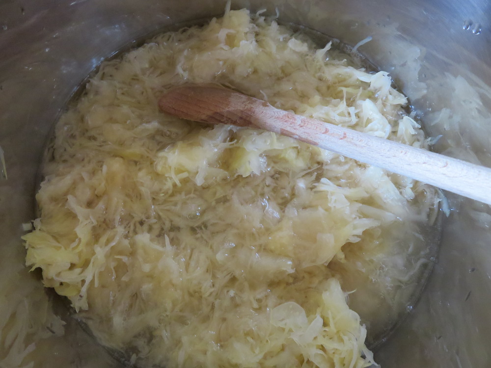 • 3 Teile Weißkohl und 1 Teil Sauerkraut (klein geschnitten) zusammen kochen