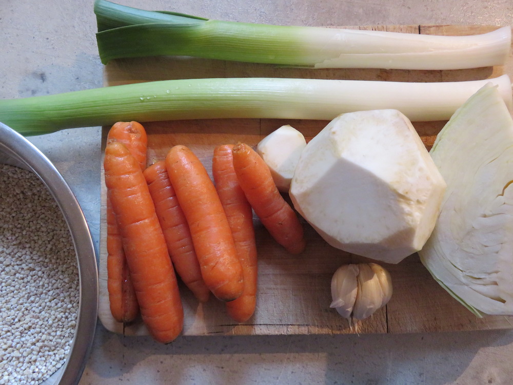 So leicht und bunt wie er daherkommt, könnte man diesen Eintopf für eine frische Frühlingssuppe halten. Es handelt sich allerdings im Zutaten aus den Erdmieten, vom Winterbeet und aus der Vorratskammer. Passt also durchaus bei dem einen oder anderen mit ähnlichem Lebensstil in die Kategorie ‚vom eingemachten Leben‘.