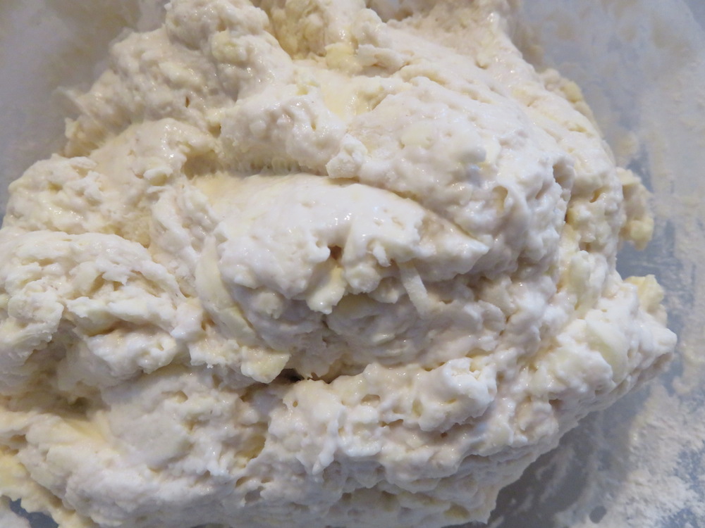 Das Mehl und Salz in eine weite Schüssel geben und die gefrorene Butter mithilfe eines groben Käsehobels schnell darauf reiben. Dabei aber immer wieder mit Mehl bestäuben, damit die Butter nicht zusammenklebt. Das Mehl mit einem Messer (und nicht mit den warmen Händen) mit der Butter vermengen, dann das kalte Wasser dazu laufen lassen und ebenfalls mit dem Messer vermengen. Ich war zuerst skeptisch, ob das so klappen würde; aber ja, es wird ein zusammenhängender Teig, nichthomogen,aber das ist in Ordnung. Der Teig wird dann mit den Händen schnell zu einer Kugel geformt und in Folie verpackt für 30 Minuten in den Kühlschrank gelegt.