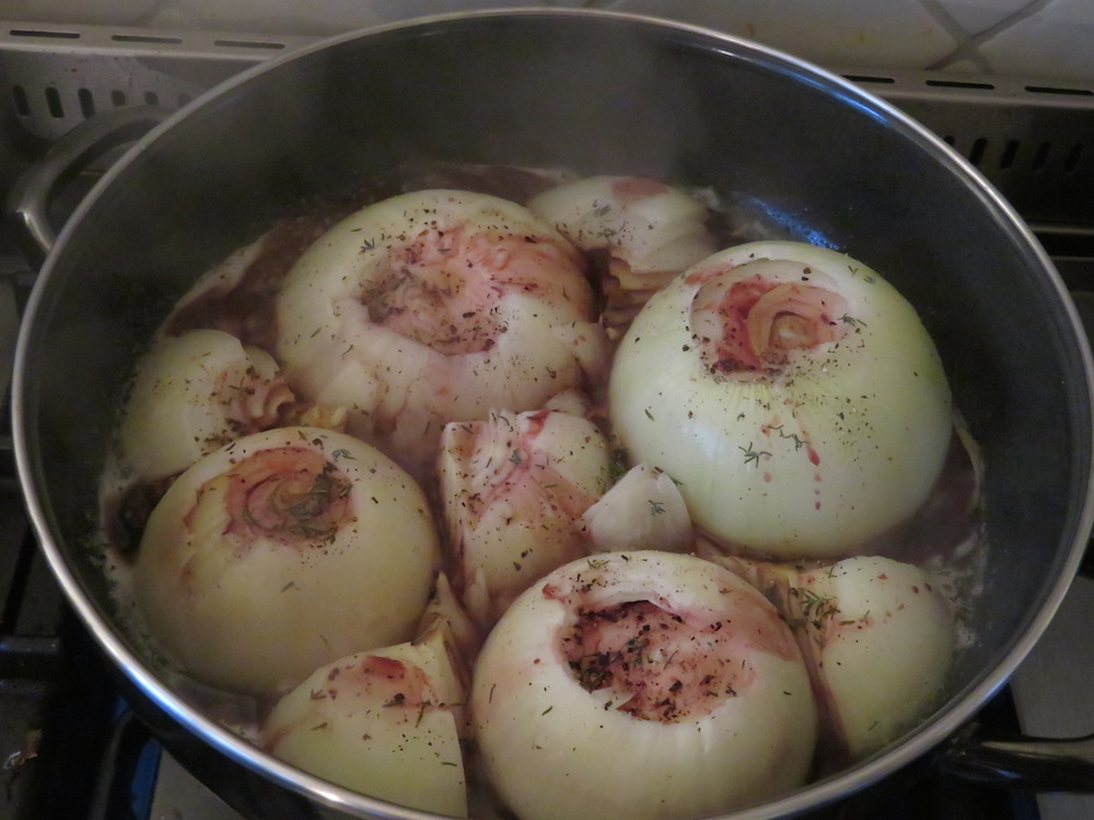 Backofen auf 170° vorheizen und in dem Bräter die Butter im Öl bei geringer Hitze zerlassen. Wenn das fett zu zischen beginnt, den Zucker zugeben, die Zwiebeln mit den Schnittflächen nach unten hineinlegen und etwaige Lücken mit geviertelten oder geachtelten Zwiebeln füllen. Bei geschlossenem Deckel soll das Ganze jetzt 10-15 Minuten karamellisieren, wobei nicht klar ist, ob es noch auf dem Herd oder bereits im Ofen stattfinden soll. Da im nächsten Schritt die Temperatur des Ofens erhöht wird, ging ich davon aus, dass er auch bei den vorgeheizten 170° bereits genutzt wird – aber natürlich karamellisiert der Inhalt in 10-15 Minuten dort nicht so schön. Also habe ich den Bräter wieder auf die Flamme gestellt.