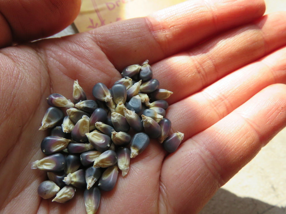 Den blauen Mais ‚Blue Cuties‘, ein Popcorn-Mais, will ich dieses Jahr unbedingt zum Fruchten bekommen. Letztes Jahr stand diese Sorte kümmerlich im Schatten der gigantomanischen Sonnenblumen, von denen ich ohnehin nicht ernten kann, weil aufgrund der feuchten Witterung im Herbst die Samen verschimmeln.