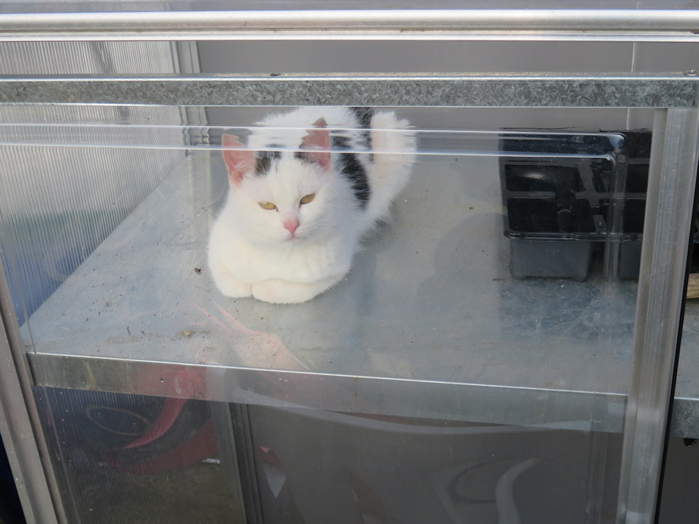 Wo wir gerade bei Leben und Austreiben sind: Huberta ist groß und sehnig geworden, fängt jeden Tag ihre Ration Mäuse (warum bloss Spitzmäuse, verflucht?) und Heinzi ist Heinzi. Klein, struppig, welpenhaft, häuslich – aber auch er will wohl wachsen und gedeihen und wenn das bei Huberta so gut klappt, in dem sie im Gewächshaus pennt, dann sollte es bei ihm ja vielleicht auch…?