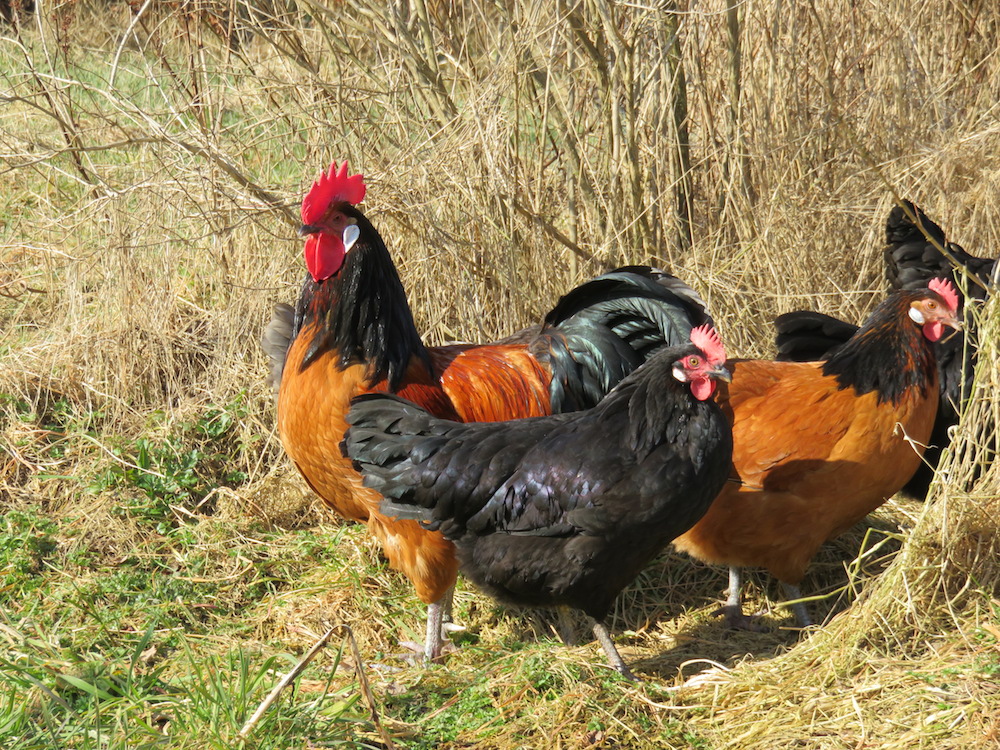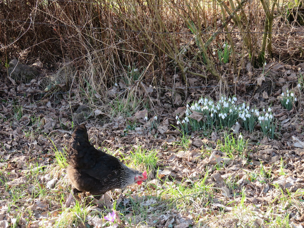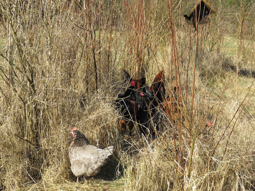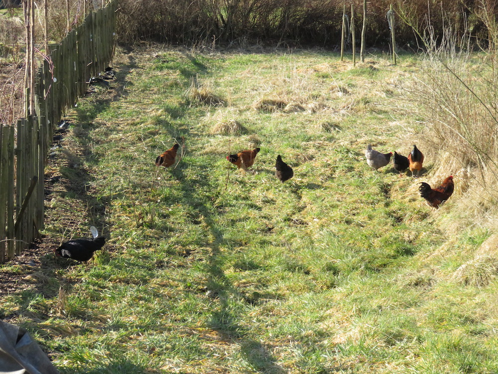 Vielleicht ist unsere Seite vom Zaun tatsächlich grüner und bei ihnen zuhause haben die Schafe die Grasnarbe eingekürzt – Tatsache ist jedenfalls: wenn unsere Koppel für Nachbarshühner ausreichend Käfer, Würmer& Gras bereithält, dann wird es wohl auch für die eigenen reichen und es gab keinen Grund mehr, die Hühnerschar in der Voliere zu halten. Zumal das Wetter sich in den letzten Tagen traumhaft entwickelt hat. Nachts gibt es zwar noch zum Teil knackigen Frost aber schon vormittags hat die Sonne so viel Kraft, dass man leicht bekleidet Gartenarbeiten verrichten kann.freilaufende-huehner2