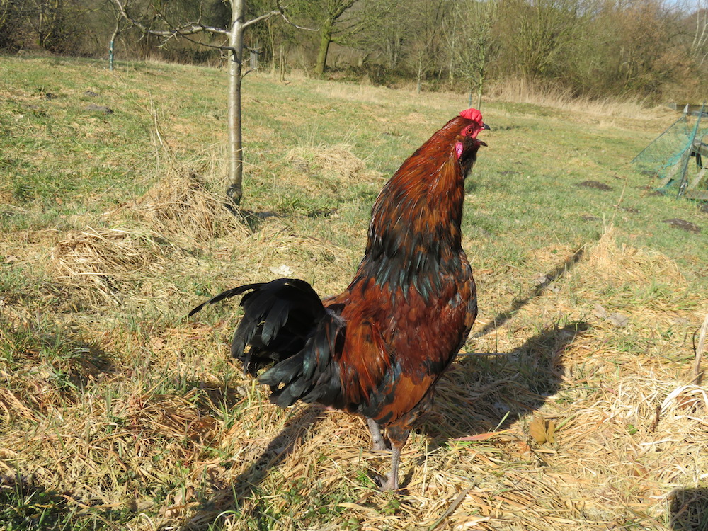 Der andere Gockel ist übrigens super entspannt, der Vorwerk-Hahn. Genau dem Zuchtziel entsprechend, ganz toll.
