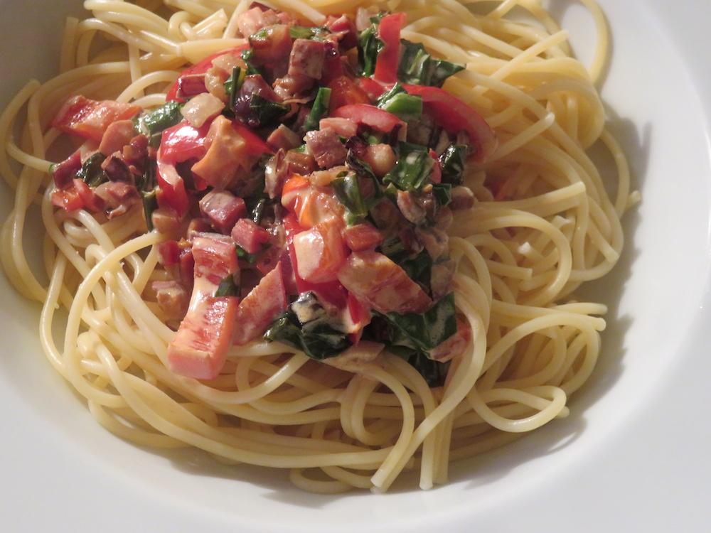 Für die Bärlauch-Sauce habe ich Zwiebeln und Speck angebraten, mit Apfelessig abgelöscht, rote Spitzpaprika, Cherrytomaten und die Hälfte des Bärlauchs zugegeben, etwas geschmort, dann wiederum mit Sahne abgelöscht, den restlichen Bärlauch zugegeben und mit Spaghetti serviert. Lecker, schnell, super simpel.