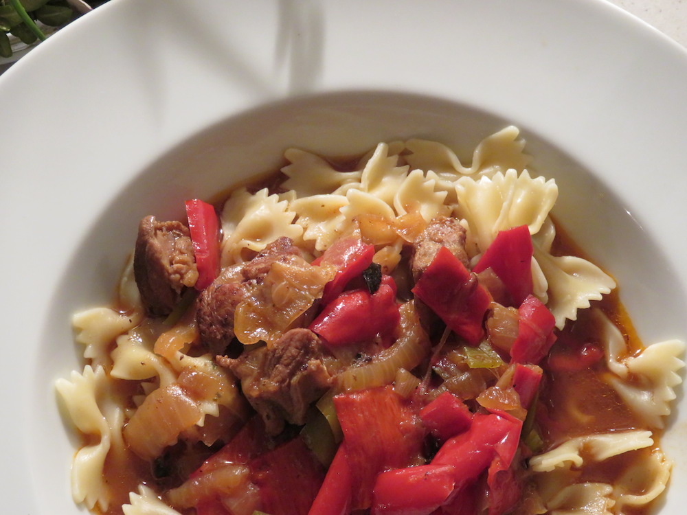 Ich habe 2 Gemüsezwiebeln in Ringe geschnitten, in einem Bräter hoch erhitzbares Olivenöl auf Temperatur gebracht und die Zwiebelringe scharf angebraten. Dann 1kg Wildschweingulasch hinterher. Als beides Farbe bekommen hatte, habe ich 4 EL Mehl darüber gegeben und gut verteilt, etwas einbrennen lassen, mit (nicht zuviel!) leichter Brühe abgelöscht bis die Masse sämig-zäh wurde. Danach habe ich mit 100g Tomatenmark tomatisiert.
