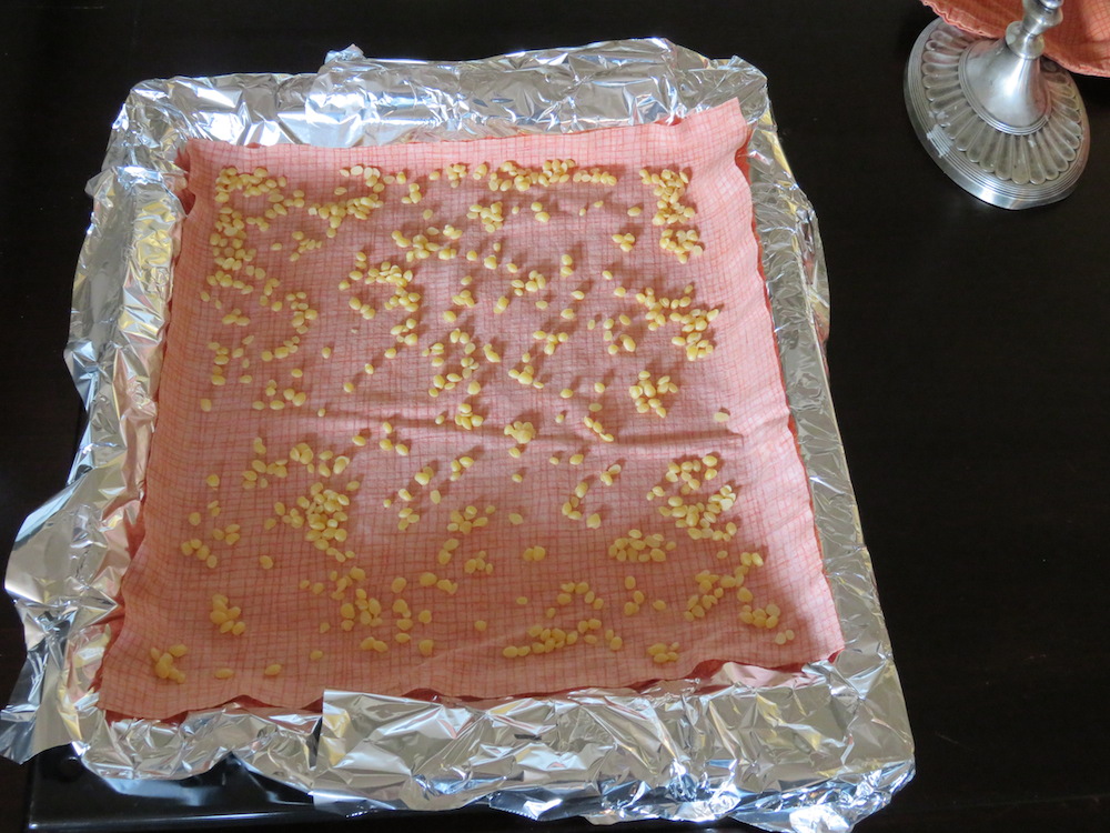 Der saubere Baumwollstoff wird einfach möglichst faltenfrei auf dem Backblech ausgebreitet und mit Bienenwachs belegt. Hat man den Wachs am Stück, kann man ihn darüber hobeln, ansonsten verteilt man nicht zu viele Kügelchen auf einmal gleichmässig.