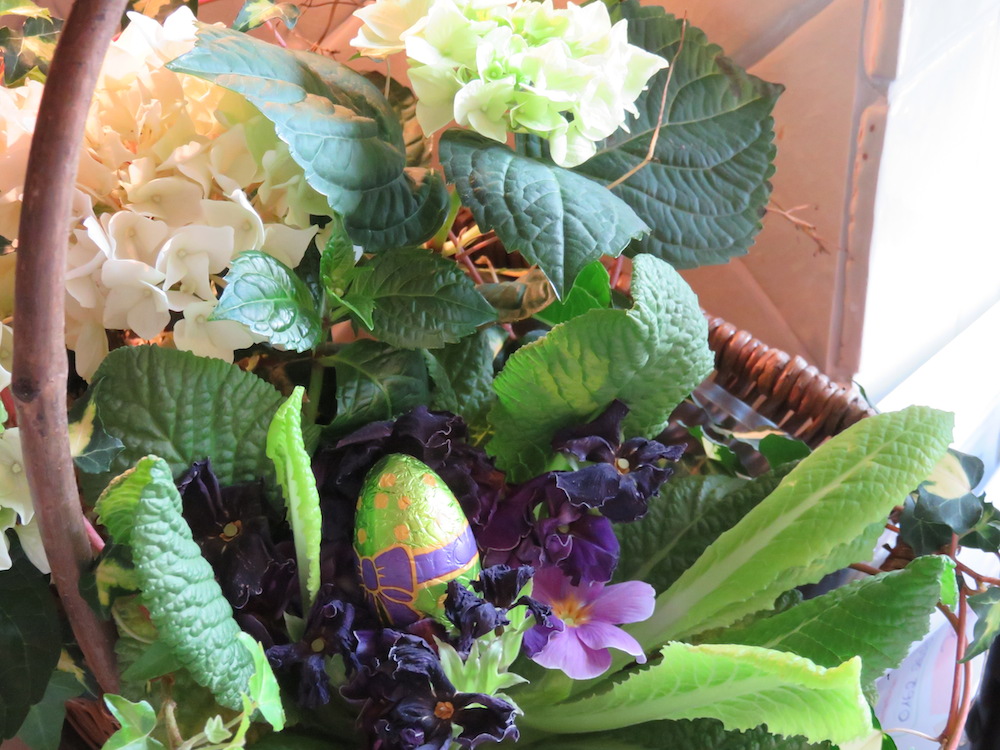 Ich benutzte Dinge aus der Vorratskammer: Fliederbeersaft, Spinat aus grün-rot gestreifter Melde, eine Kaltschale aus schwarzen Johannisbeeren, Kurkuma und 2 angebrochene Gläser süß-saure Rote Bete aus der hintersten Ecke des Kühlschranks. Das Osternest selbst besteht aus überständigem, verdorrten Gras aus dem Garten – vermutlich Quecke.