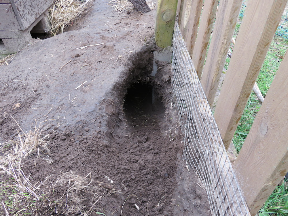 Das Gehege sieht mittlerweile aus wie ein Schweizer Käse und ich traue mich kaum noch den Boden zu betreten um auszumisten. Neulich habe ich es tun müssen und siehe da: diese Gänge sind – obwohl sie so ziemlich direkt unter der Erdoberfläche verlaufen – irgendwie gut statisch abgesichert. Die kleine Erdschicht hält mein Fliegengewicht aus obwohl es kein gewachsener Boden ist, sondern Aushub von dem ersten Bauvorhaben.