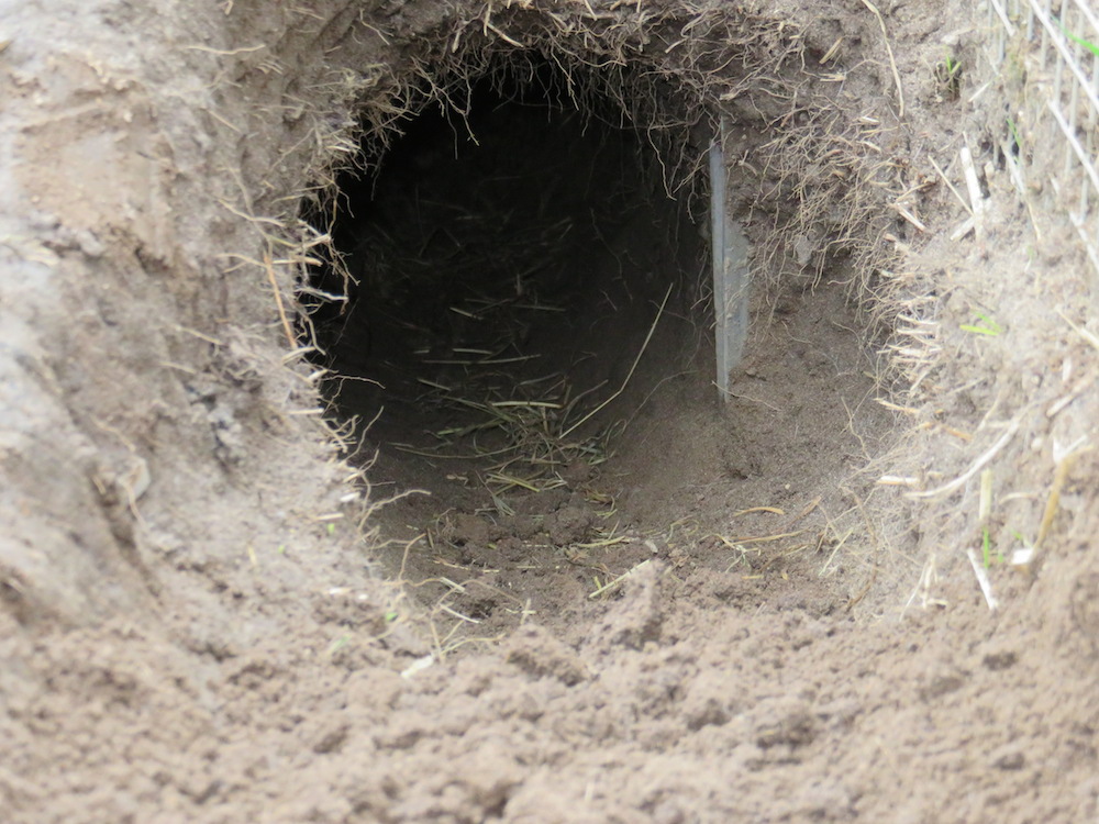 Natürlich, selbstverständlich – ist doch klar, dass die Karnickel ihre Erdarbeiten genau dort ausführen müssen, wo ein Pfeiler in einer Einschlaghülse befestigt ist!