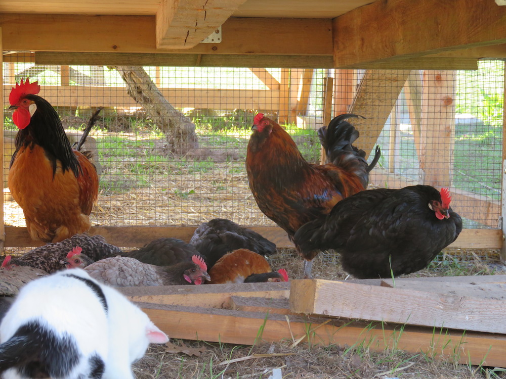 Die Hühner, die ja seit einiger Zeit das komplette Grundstück nutzen dürfen, haben sichtlich Spaß. Und sie erinnern mich immer mehr an Raptoren; wenn sie mich erblicken, rennen sie wie kleine Saurier auf mich zu und schaffen die Distanz von äussersten, unteren Ende des Gartens bis hinauf zu mir extrem schnell. Kein Wunder bei den köstlichen Mahlzeiten, die ich ihnen vorsetze. Mittags sind die Hühner dann so müde, dass sie sich für ein Schläfchen unter den Stall auf den Huderplatz zurückziehen. Schlafende oder dösende Hühner sehen irgendwie seltsam aus, oder?