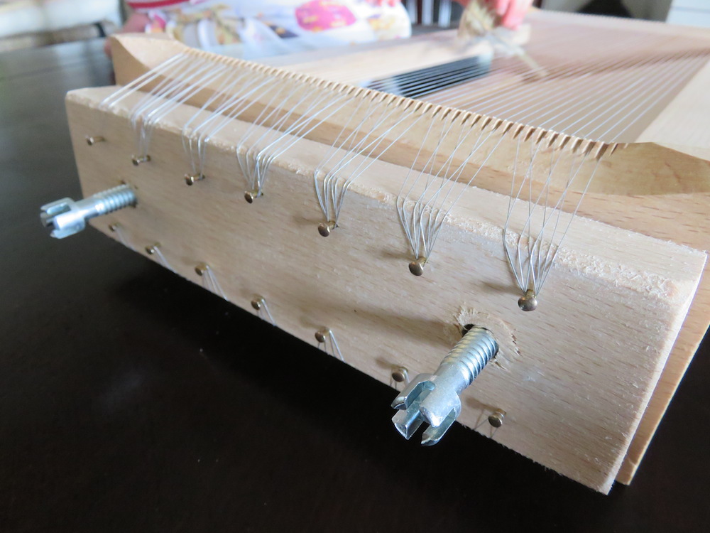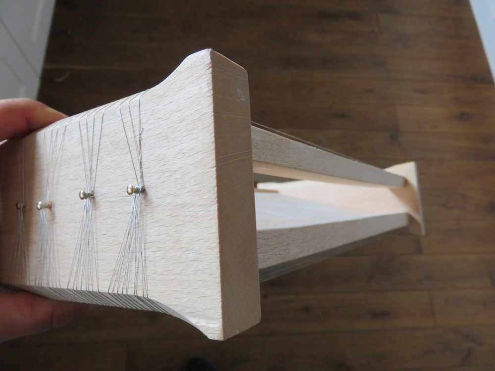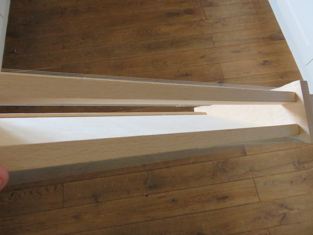 Unter den Drahtsaiten befindet sich eine Rampe aus Holz – logisch, das ganze Teil ist ja bis auf Schrauben und Saiten aus Holz – über diese können die fertigen Rohnudeln später prima heruntergleiten. Mit oder ohne Hilfe.